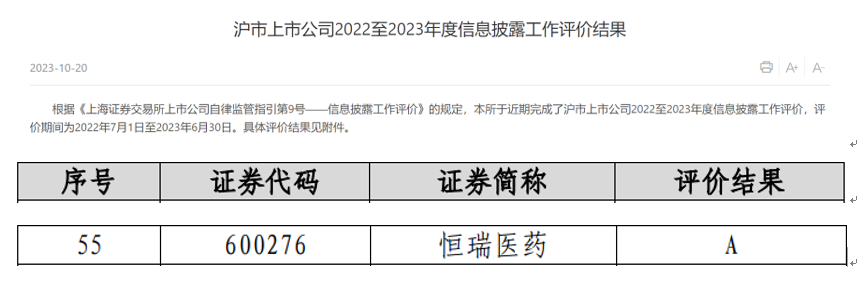 永利皇宫官网医药荣获上交所信息披露考评A级