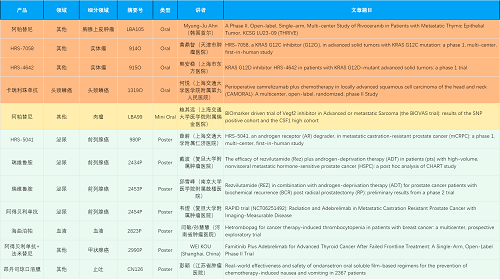 在胸腺上皮肿瘤、头颈鳞癌、肉瘤、前列腺癌、甲状腺癌等其他多个疾病领域,卡瑞利珠单抗、阿帕替尼、瑞维鲁胺、阿得贝利单抗、法米替尼、HRS-7058、HRS-4642、HRS-5041等抗肿瘤创新药相关研究一共入选了4项口头报告、1项简短口头报告、5项壁报,彰显了永利皇宫官网医药强大的研发实力。此外,海曲泊帕和昂丹司琼口溶膜分别在防治化疗导致的血小板减少和恶心呕吐方面各有1项研究入选壁报。
